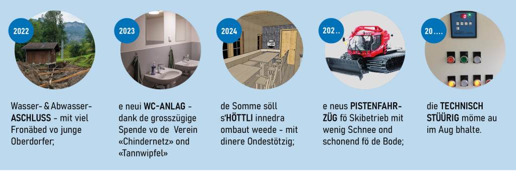 Me Inhaber ond öseri Familene deckid alli Ufgobe fö de Betrieb ond alls dromom ab ond schaffid unentgeltlich. So chöme de finanziöll Ufwand möglichst chlii halte ond de ganz Gwönn in Lift investiere. Fö grösseri Investitione isch de Skilift abe uf Ondestötzig agewese – da göltet fö scho omgsetzti Projekt, abe au fö Sache wo me i Zuekunft wend ode mönd apacke: